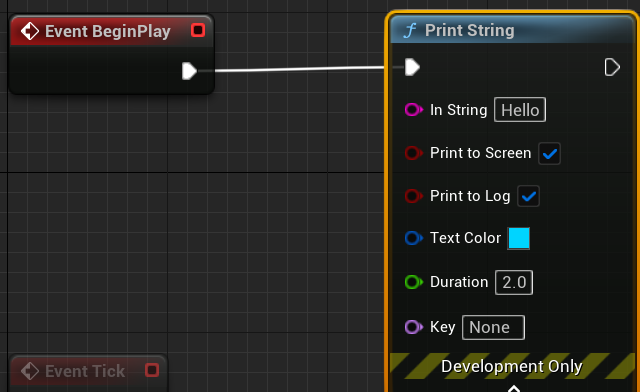 Print String은 받는 매개변수고 참 많은데, 언리얼로 개발을 한다면 가장 많이 쓸 것 같은 함수 중 하나이다. Unity의 Debug.Log가 화면에서도 나온다니! 정말 편리한 함수가 아닐 수가 없다.