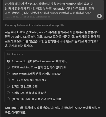암튼 Arduino CLI는 잘 세팅을 못해줘서... 내가 스스로 세팅하고 칩이랑 모니터랑 빵판에서 연결했다. 대충 어떻게 연결했는지 알려주고 코드를 짜달라고 하니까 잘 짜주더라