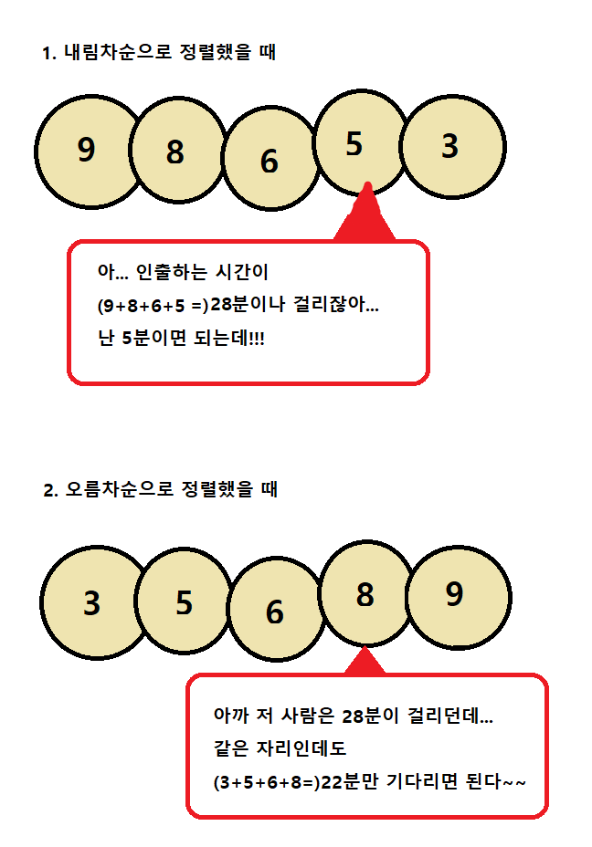 그렇기 때문에 앞 쪽에 있는 사람이 인출 시간이 적을수록 총합의 최솟값이 되는 것이다.