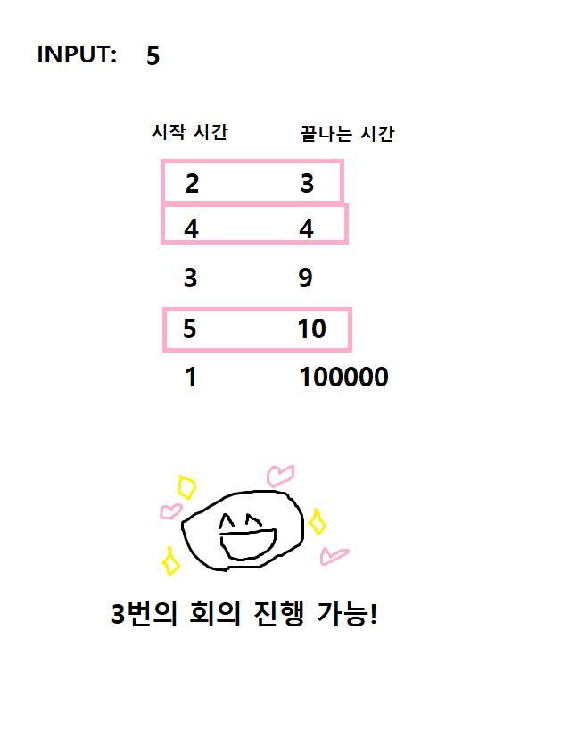 만약 시작 시간이 오름차순이었다면, 끝나는 시간이 최댓값인데도 시작 시간과 계속 비교하며 최악의 경우 한 번의 회의밖에 하지 못한다.